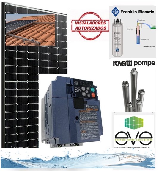 7 modulos fotovoltaicos Canadian solar de 550wp proporcionara la tensión adecuada a un variador de velocidad Fuji Electric FRENIC -Ace de 2cv de potencia especifico para bombeo solar, el cual de manera instantánea y eficaz a través de su sistema MPPT regulara la velocidad del motor en función de la potencia que suministre el campo fotovoltaico proporcionando un flujo continuo de agua con un caudal a su máxima potencia de 7 horas en verano y 3 en invierno