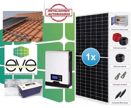 1 Montaje mecánico e instalación eléctrica del kit: Montaje de estructura y modulos fotovoltaicos, instalación de cableado solar y toma de tierra de estructura, cableado bajo tubo de poliamida hasta cuadro de protecciones de corriente continua el cual dispondrá de dos bases de fusible y un limitador de sobretensiones, colocación de inversor y batería, conexionado y puesta en marcha, colocación de cuadro de protección de corriente alterna el cual dispondrá de un interruptor general apropiado para la potencia de salida del inversor y un interruptor diferencia. Este kit no incluye la instalación eléctrica  interior ( puntos de luz y tomas de corriente etc..)
