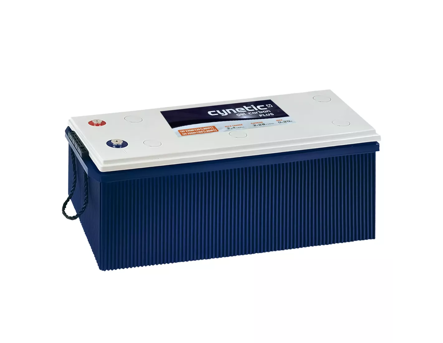 1 batería cynetic gel carbon 250Ah: Esta batería acumula la energía generada para poder utilizarla en cualquier momento que se necesite. Es una batería monoblock de 12 voltios y 250Ah C100 de gel sin mantenimiento con aditivo de micro carbon para alargar su vida útil. La batería cynetic gel carbon 250 esta preparada para soportar los ciclos de carga y descarga de la instalación y debido a su baja resistencia interna, tiene una alta eficiencia de carga. No tendremos que reponer agua destilada en toda su vida útil.